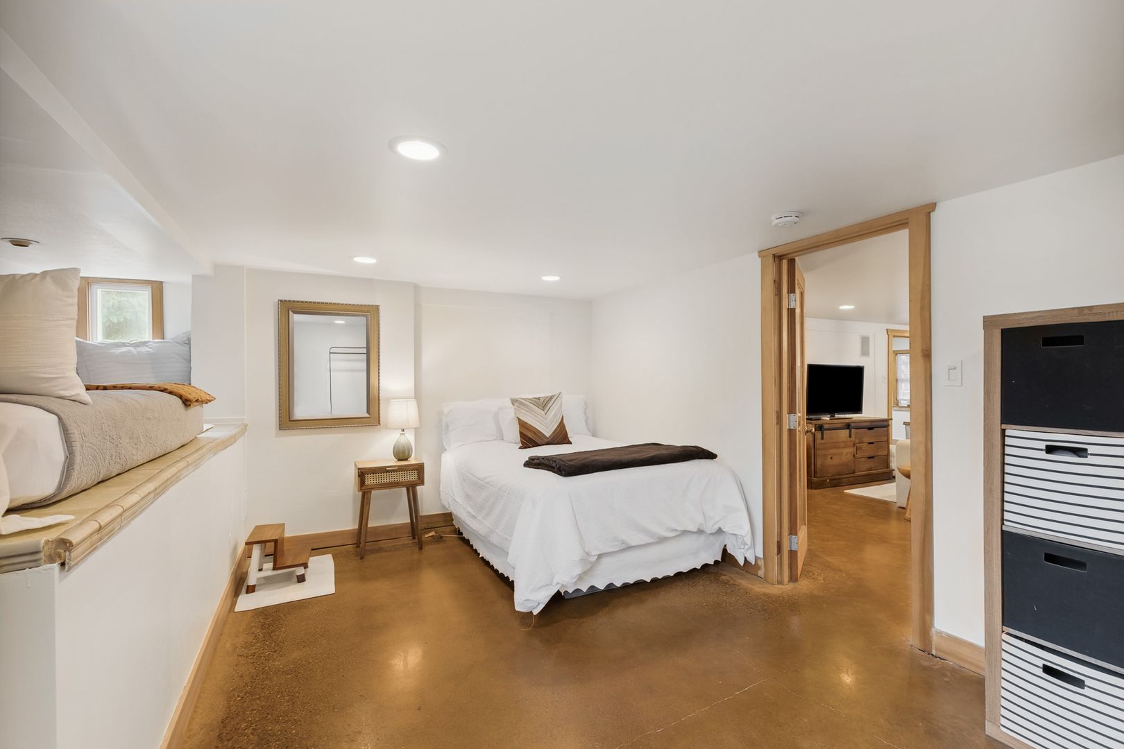 Retreat to a serene bedroom featuring both a queen and twin bed, plus a cozy reading nook. Step outside to relax in the shared yard and patio space, perfect for dining al fresco or unwinding with your favorite book.