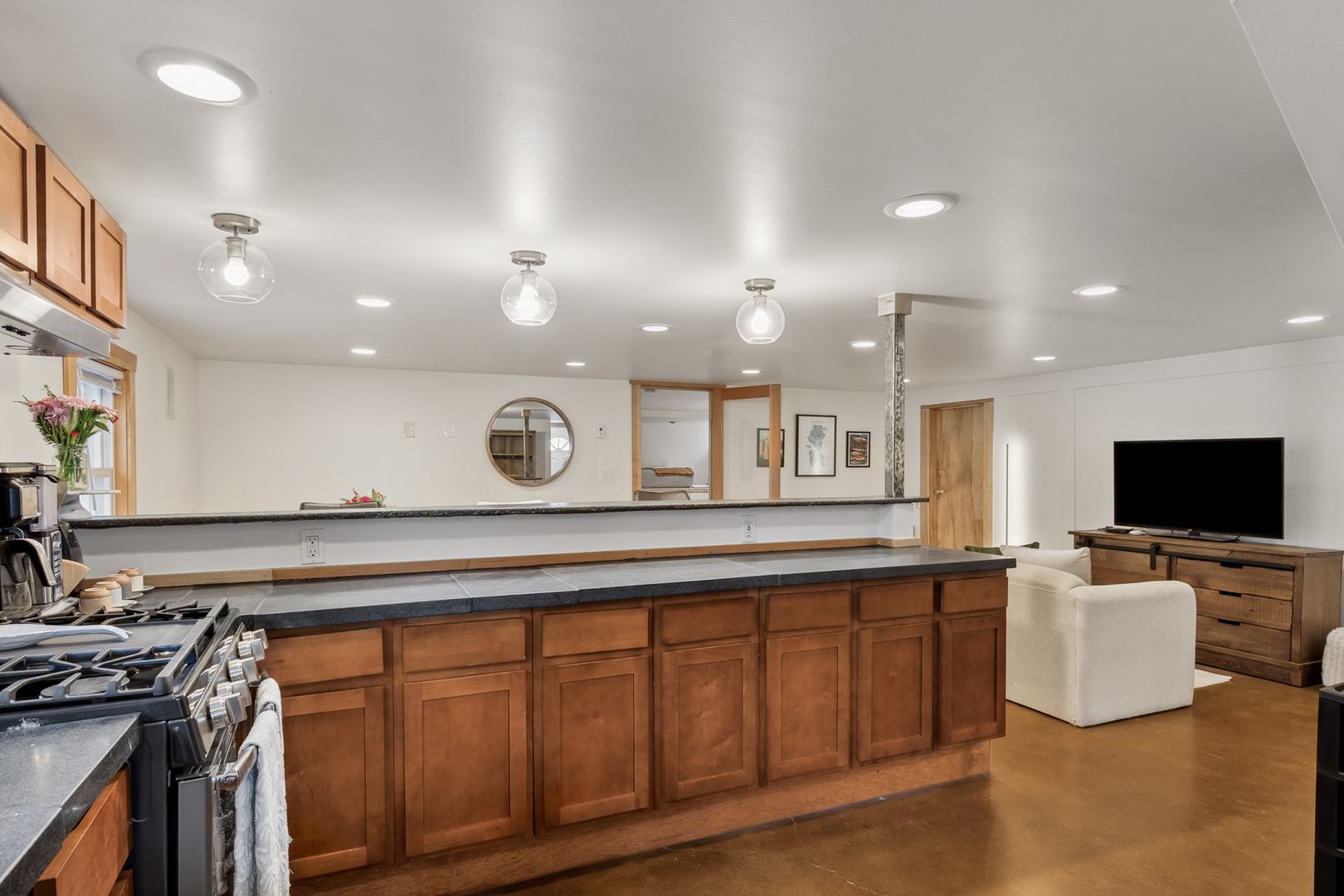 Enjoy a fully stocked kitchen with generous countertops, bar seating, and abundant cabinetry. The spacious bathroom offers plenty of storage, and you’ll appreciate the convenience of a private in-unit washer and dryer.